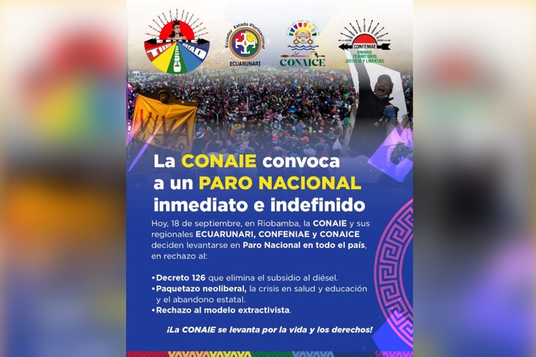 Em um Congresso Ampliado Extraordinário que se estendeu por mais de seis horas na cidade de Riobamba, realizado na tarde desta quarta-feira, 18 de setembro, a Confederação de Nacionalidades Indígenas do Equador (CONAIE) decidiu convocar um levante nacional contra as recentes medidas econômicas de caráter neoliberal implementadas pelo governo equatoriano.