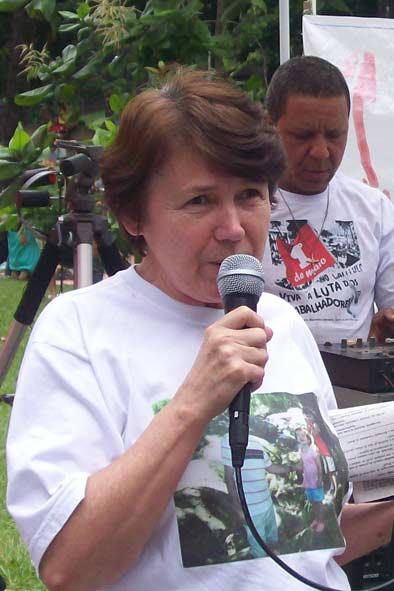 Margarida Mereci, Diretora do Centro Cultura Casa das Américas, de Nova Friburgo, saúda os trabalhadores. Quinta da Boa Vista, Rio de Janeiro-RJ.